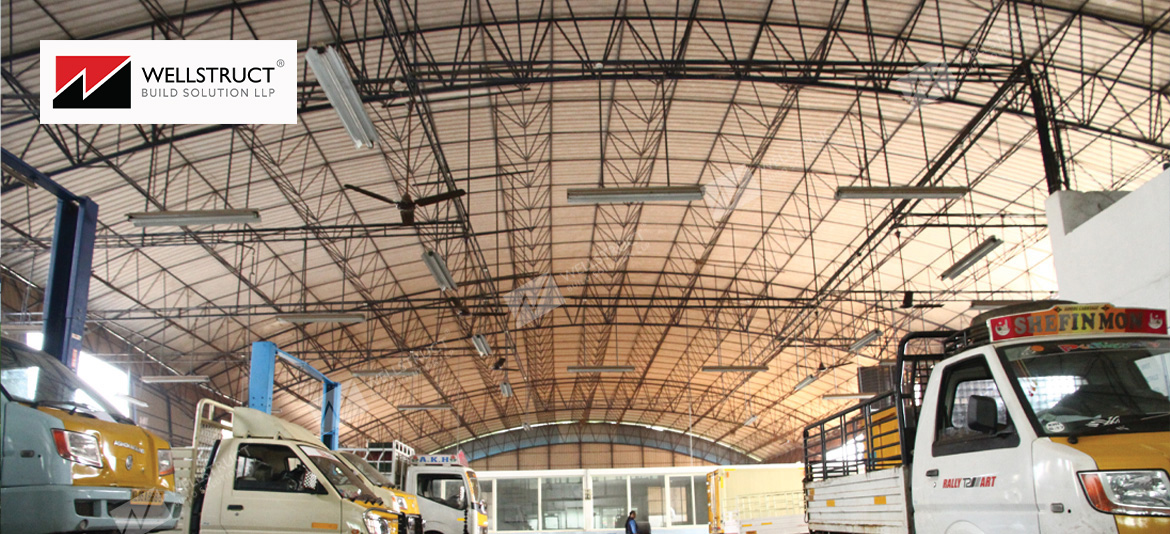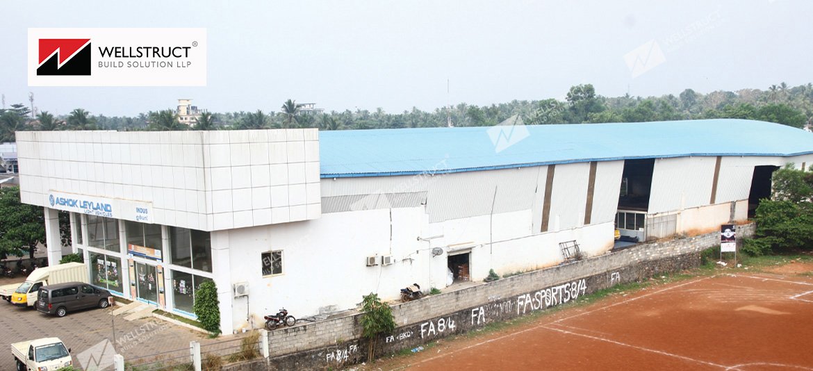 The Ashok Leyland popular dealer is located at Calicut having curved roof architectural view having 34mtr clear span with space frame rafters and concrete columns. Inside showroom area is widely utilized as there is no intermediate columns between the span, all the structural frames are fabricated using tubular structure design with tata brands. Roof cladding and side cladding are using bare galvalume profile tata blue scope material.