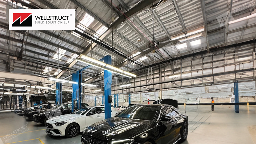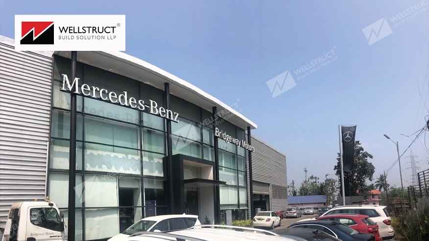 Benz showroom of Indus motors is located at feroke calicut. The building is constructed using pre engineered building technology of a remarkable span 44 meter. First floor is concreted on metal deck panel to achieve the normal concrete finish to lay the floor tile. The showroom inside have large clear span of 8 mtr column to column bed space it will increase the beauty esthetically.